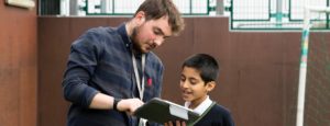 Teacher showing pupils something on iPad